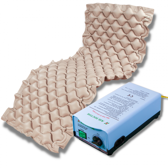 Adjustable into 5 level of air pressure/volume to match the patient weight. Circulating in 5-min interval. It prevents bedsore by distributing pressure on a patient body. Mattress Size: 85cm(W) X230cm(L)x7cm(H). Material: PVC.